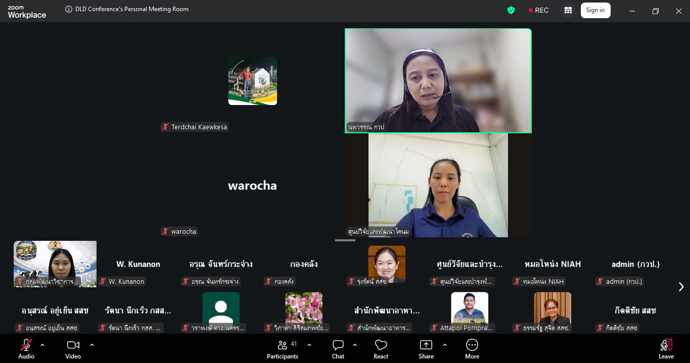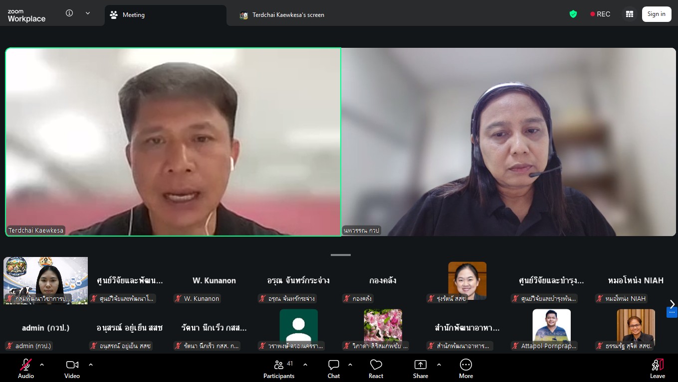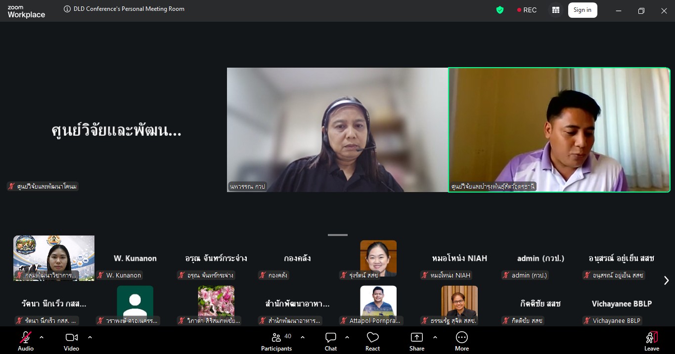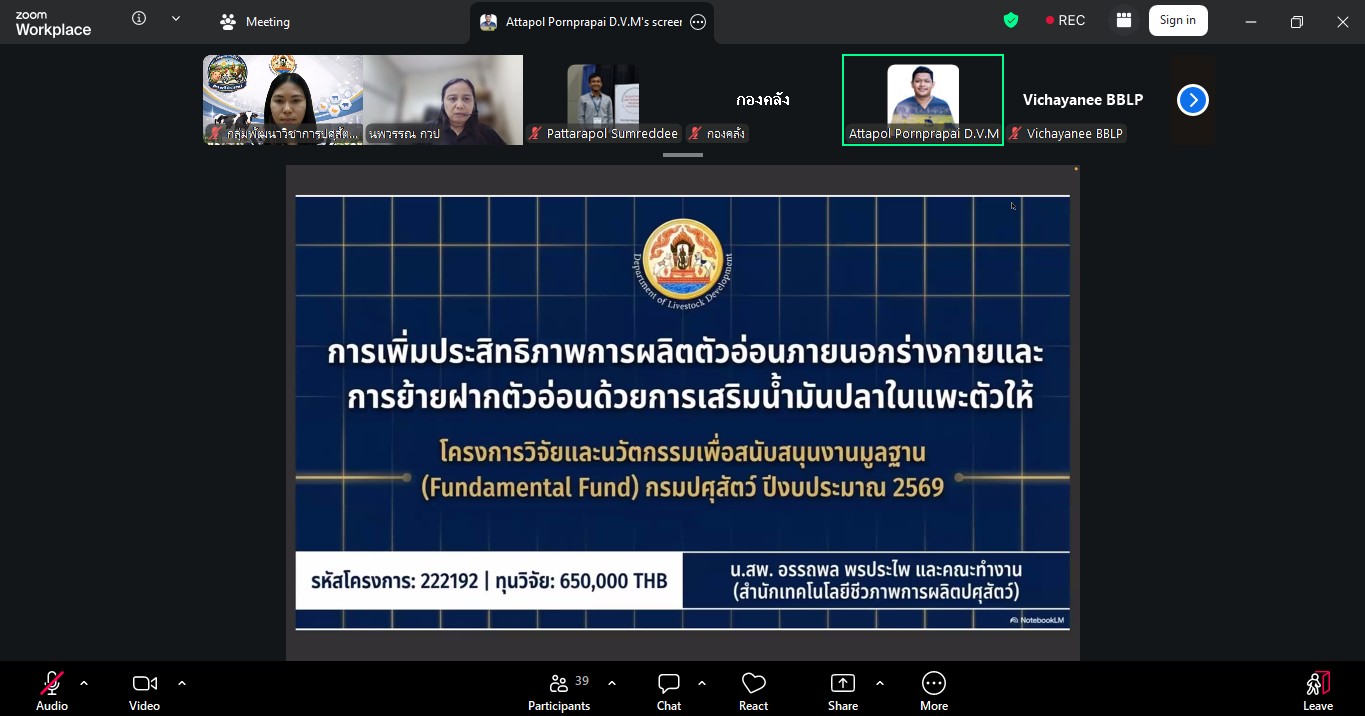 วันที่ 24 มีนาคม 2569 เวลา 09.30 น. กลุ่มพัฒนาวิชาการปศุสัตว์ จัดประชุมติดตามความก้าวหน้าและการปิดโครงการวิจัยที่ได้รับจัดสรรงบประมาณจากกองทุนส่งเสริม วิทยาศาสตร์ วิจัยและนวัตกรรม (ววน.) ปีงบประมาณ พ.ศ. 2569 ผ่านสื่ออิเล็กทรอนิกส์ ระบบ zoom ซึ่งมีผู้เชี่ยวชาญนพวรรณ บัวมีธูป หัวหน้ากลุ่มพัฒนาวิชาการปศุสัตว์ เป็นประธานในที่ประชุม