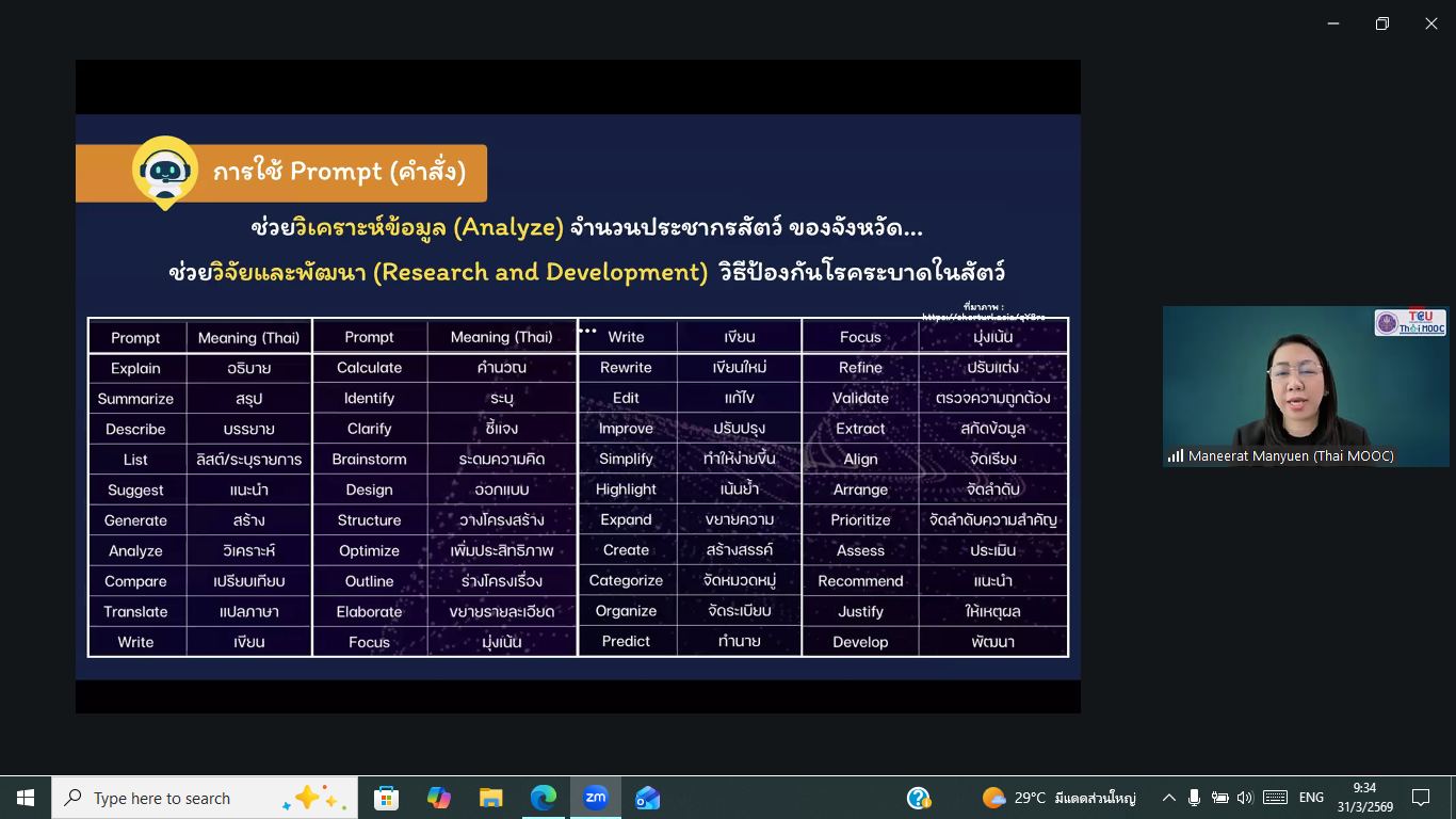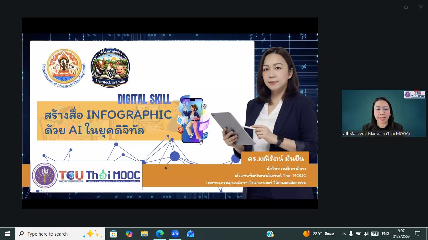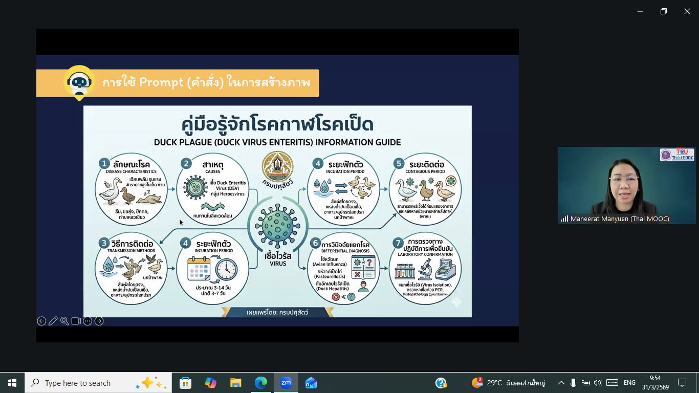 วันที่ 31 มีนาคม 2569 เวลา 09.00 น. กลุ่มพัฒนาวิชาการปศุสัตว์จัดเวทีวิชาการปศุสัตว์ ครั้งที่ 46 เรื่อง “สร้างสื่อ INFOGRAPHIC ด้วย AI ในยุคดิจิทัล” โดยมีผู้เชี่ยวชาญนพวรรณ บัวมีธูป หัวหน้ากลุ่มพัฒนาวิชาการปศุสัตว์ เป็นประธานการอบรม ซึ่งการอบรมในครั้งนี้ได้รับเกียรติจาก ดร.มณีรัตน์ มั่นยืน นักวิชาการศึกษาอิสระตัวแทนทีมประชาสัมพันธ์ Thai MOOC กระทรวงการอุดมศึกษา วิทยาศาสตร์ วิจัยและนวัตกรรมในการถ่ายทอดความรู้ และ workshop การใช้ Prompt (คำสั่ง) ในการสร้างภาพ, สร้าง Infographic และงานนำเสนอด้วย Gemini Canvas,วิเคราะห์และออกแบบ Content ด้วย Gemini, สรุปงานวิ เคราะห์ข้อมูลด้วย Notebook LM และ King AI ผ่านสื่ออิเล็กทรอนิกส์ระบบ zoom และเพจ facebook กลุ่มพัฒนาวิชาการปศุสัตว์